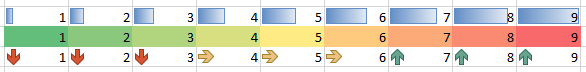 Za pomocą tej funkcji (funkcji jako funkcjonalności Excela, nie funkcji w formule!) możemy nadać zaznaczonym komórkom nie tylko kolor zależny od wartości tej komórki, ale także od komórek w zaznaczonym bloku i nie tylko. Warunkowe, ponieważ komórki przyjmują określony kolor pod pewnym warunkiem, np. że są ujemne, większe od czegoś itp. Podstawowe zastosowanie jest rzeczywiście takie, że wskazana komórka będzie miała inny kolor, zależnie od jej wartości. Jeśli zaś zaznaczymy blok komórek i wskażemy lub zdefiniujemy stosowne reguły, mogą one przyjąć inny wygląd w zależności od rozkładu wartości w bloku, czy jest poniżej/powyżej średniej (lub skrajnych 10%) w bloku itp. Oprócz formatowania podobnego do „statycznego”, bez reguł warunków, możliwe jest także formatowanie warunkowe z użyciem pasków danych – gdy komórki są częściowo wypełnione paskiem koloru, oraz skali kolorów – gdy komórki w bloku przyjmują kolory stopniowo z pewnej skali barw, a także zestawów ikon, bp. strzałek, wyświetlanych w obrębie komórek, które wskazują np. trend w bloku, jak na rysunku poniżej.
