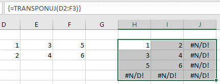 =TRANSPONUJ({1\2;3\4;5\6}) – wynik: {1\3\5;2\4\6}.