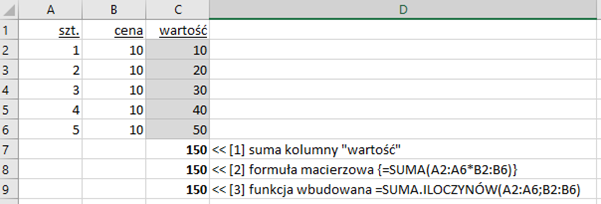 Formuła [2] jest w postaci macierzowej (z nawiasami klamrowymi) – argumentem funkcji SUMA jest macierz wyników mnożenia dwóch wektorów cena i szt. Co tu zwraca uwagę, to znak operatora mnożenia między A6 i B2, tymczasem operator dotyczy odpowiadających sobie elementów dwóch wektorów po obu stronach znaku mnożenia. Zapis blok1*blok2 należy rozumieć jako operację na elementach macierzy (tu mnożenie), która daje w wyniku macierz iloczynów, na której dopiero działa funkcja SUMA i zwraca sumę elementów macierzy (tych iloczynów).