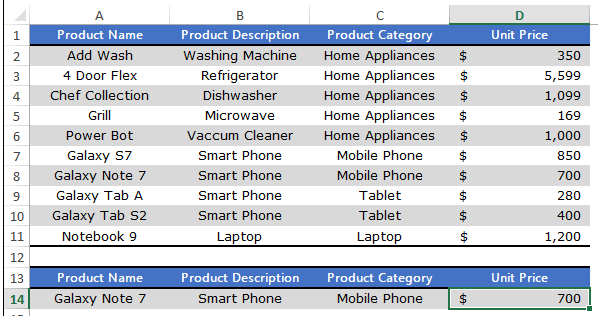 Przykłady, gdy kombinacja tych dwóch funkcji pokazuje swoją siłę można by mnożyć i można ich wiele znaleźć w literaturze dla zaawansowanych użytkowników. Jeszcze zaś więcej możliwości uzyskujemy w połączeniu z omawianą wcześniej techniką formuł macierzowych – możemy dopasować wiele kryteriów, np. w przykładzie poniżej (źródło: excelchamps.com), mamy trzy kryteria w wierszu 14, które muszą być spełnione wszystkie razem, mamy zaś w wyniku wskazać cenę w komórce D14: