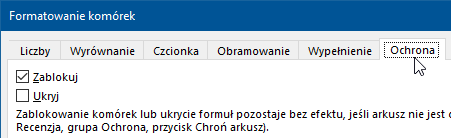 Opcja Zablokuj jest nieco myląca przez to, że domyślnie jest zawsze włączona, ale ta ochrona nie działa. Kolejność postępowania jest tu taka, że wszystkie komórki arkusza będą chronione, ale najpierw musimy zdjąć tą ochronę z komórek, które mają być edytowalne (wyłączyć tą opcję „formatowania” dla zaznaczonych komórek lub zakresów), a następnie aktywujemy ochronę na poziomie całego arkusza, która zadziała dla wszystkich komórek, które mają pozostawioną opcję Zablokuj.